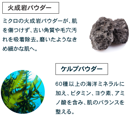 ミクロの火成岩パウダーが、肌を傷つけず、古い角質や毛穴汚れを吸着除去。磨いたようなきめ細かな肌へ。